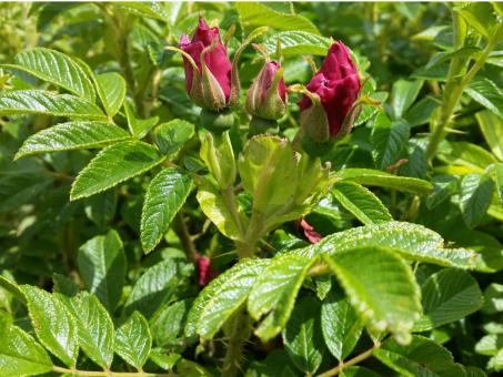 Wuchs und Verwendung Die Bodendeckerrose 'Rotes Meer' ist eine unempfindliche Rosa rugosa Hybride, die den Betrachter von Juni bis Oktober mit ihren tief-roten Blüten erfreut.